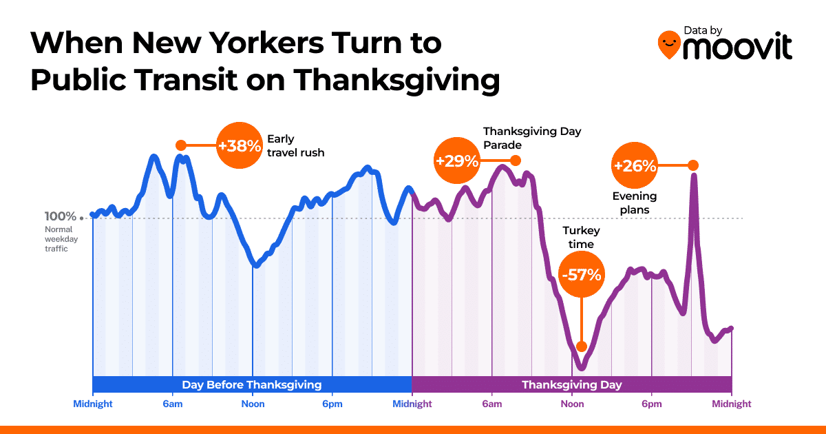 “Thanksgiving in New York has a distinct rhythm,” said Ziv Kabaretti, Moovit’s Chief of Product. “The data shows New Yorkers wake up early to get a head start on travel, flock to the parade or to public transportation hubs and airports, and then pause as families gather. After dessert? The city comes alive again.”